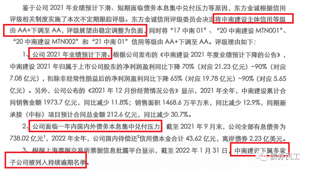 此前的2022年2月24日,東方金誠披露了《關于下調江蘇中南建設集團股份有限公司主體及相關債項信用等級的公告》,將中南建設的主體信用等級由AA+下調至AA,并將評級展望調整為負面。本次評級下調的主要原因是公司2021年業績預計下滑、面臨集中兌付壓力、子公司被列入票交所逾期名單等。