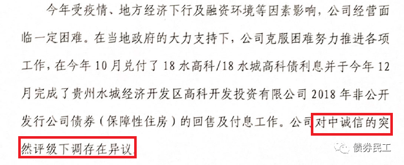貴州水城經投在2020年12月18日發布公告,明確指出“對突然評級下調存在異議”。從后期的信息披露情況來看,貴州水城經投應該是沒有向評級公司提出了正式的復議申請,因為如果發行人正式提出了異議申請,評級機構需要出具明確的復議結果并公告。