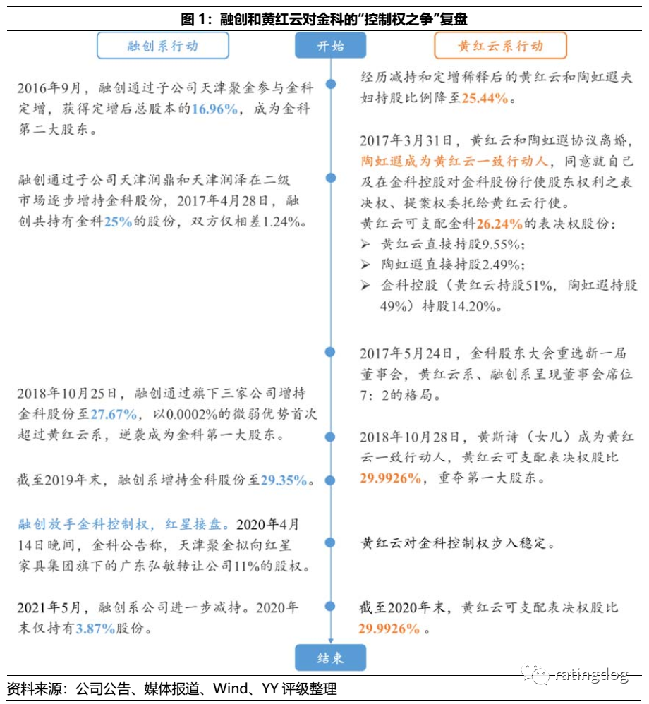 經營邊際來看,公司上半年銷售和回款正常,土儲充足,在19年擴張中加大城市下沉,導致目前尚存約四成土儲位于三線及以下城市。20年至21Q1,公司有意提升拿地城市能級,僅從2021Q1新獲土儲來看,公司保持了大本營重慶的優勢,但在其他城市的土儲質量則存在分化。財務方面,公司三道紅線指標在2020年末快速轉綠,即得益于債務受控和經營回款,也依靠物業子公司分拆上市、發行永續債和增加少數股東權益等手法。與此同時,公司表內融資結構惡化值得關注,而YY之前深度報告所述的表外債務風險也并未緩解。黃紅云與融創對金科地產集團股份有限公司(以下簡稱“金科”或“公司”)的“控制權之戰”打了近四年,中途黃紅云曾對媒體堅定表示“金科就是我的生命”,“個人不會放棄公司控制權”,他通過和前妻+女兒結為一致行動人、修改公司章程掌控董事會等操作,并留有至高可達9%股比的員工持股計劃作為后手,最終贏下了這場明爭暗斗。