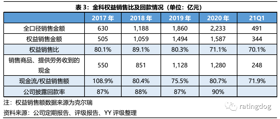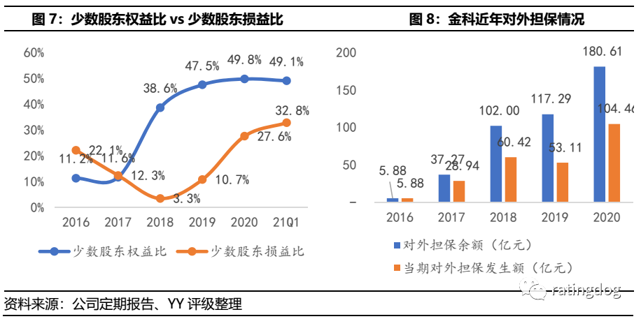 另一方面,指標快速“轉綠”固然得益于有息債務被限制增長,但更主要的原因是2020年末凈資產同比增厚213.5億元,主要方式包括:(2)2020年11月公司分拆控股子公司金科服務到香港聯交所上市(2020年末公司持股52.33%),帶來資本公積增加約30億元;(3)發行永續債,2020年末永續債余額21.42億元,較2019年末增長13.42億元。公司近兩年的少數股東權益占比已接近一半,規模較大,而且2020年少數股東損益比約27.6%,跨期對比不匹配,潛在為非股比分配特征,“明股實債”嫌疑較大。而且公司存在造表痕跡,僅2020年,金科就將8家子公司移出表內,理由為“少數股東增資或根據相關補充約定而導致公司喪失控制權”,這8家子公司全部虧損。近年公司及其子公司對外擔保余額攀升明顯,截至2020年末達181億元,如同之前深度報告所述,表外債務風險值得關注,而且并未緩解。距離“門口野蠻人”融創退場僅過去一年多,金科兩大股東的離婚財產分配糾紛已上升至一致行動關系破裂。截至本報告日,公司尚未就深交所關注函要求,披露解除一致行動關系的具體內容。我們根據目前信息推測,解除一致行動人后,黃紅云仍可保住金科實控人地位,董事會中黃紅云的話語權也更勝一籌。但是金科股權結構分散,實控人持股比例相對少,始終留有隱患;且關注其近年來股權紛爭不斷,真實掌控力可能也顯著受影響,股權端的風險不可忽視,這個后續會影響生存策略的選擇,會有階段性短視行為和利益的重分配,造成公司財務政策的波動顯著放大。經營邊際來看,公司銷售回款正常,有息債務規模也被“做表”控制住了,三道紅線指標在債務受限、物業子公司分拆上市、永續債、少數股東權益增厚的共同作用下轉綠,但是考慮表外風險只是調整的一個手段,整體的財務上的穩健性存疑。目前觀察點在于,土儲周轉正常,如股權紛爭告一段落,且不影響財務如分家等短期利益分配的事情,公司的邊際惡化可止住。未來需持續觀察。