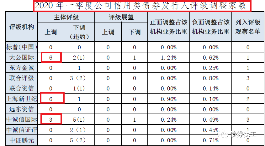 同期對比來看,僅在2020年第一季度,主體評級上調(diào)的發(fā)行人數(shù)量就已經(jīng)有15家,主體評級下調(diào)的發(fā)行人數(shù)量為13家,監(jiān)管新規(guī)之后的對比數(shù)據(jù)還是很明顯的。