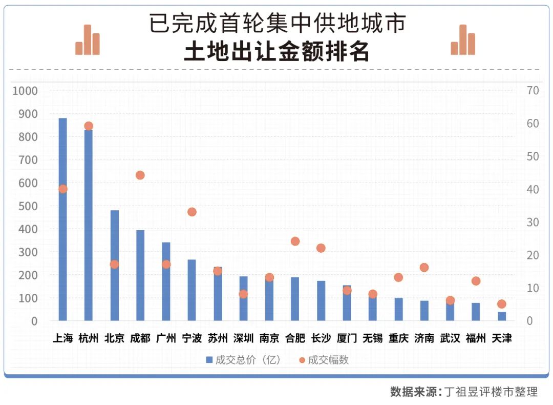 從已完成首輪集中土拍的城市來看,上海土地出讓金額仍排在首位,其次是杭州和北京。可以看出,上海市場仍然在房企投資中占據(jù)重要地位