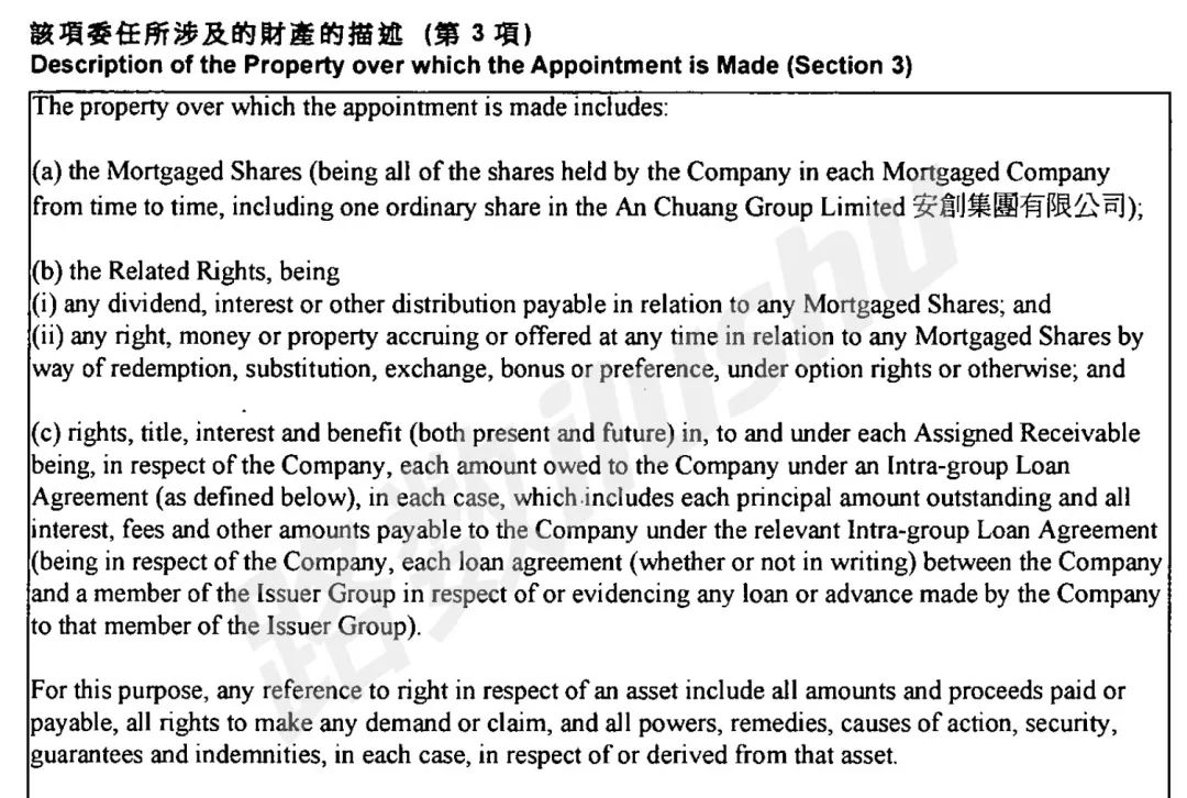 可以看到,Kroll作為接管人可以行使各項(xiàng)股東權(quán)益,比如資產(chǎn)收益權(quán)、處置權(quán)。細(xì)到花樣年所持有的一家名為安創(chuàng)集團(tuán)有限公司的普通股。