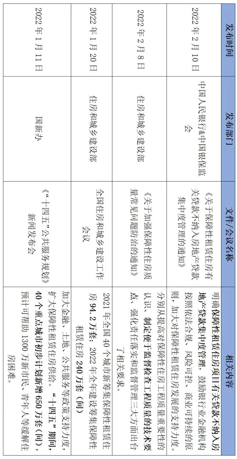 2022年第一季度,中央及各地方政府相繼發(fā)布發(fā)展保障性租賃住房的實施意見,明確保租房供應(yīng)目標(biāo),加強金融支持,完善金融服務(wù)體系,強調(diào)工程質(zhì)量重要性,加速推進保障性租賃住房的建設(shè)。