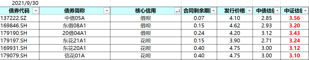 如果說租賃債權(quán)、應(yīng)收賬款等產(chǎn)品底層資產(chǎn)仍然具有一定異質(zhì)性的話,在房企供應(yīng)鏈、同一主體發(fā)行的同質(zhì)化消費(fèi)金融資產(chǎn)等產(chǎn)品中,收益率仍有較大偏差。這種偏差可能是由于交易所ABS/定向ABN是私募發(fā)行,估值機(jī)構(gòu)較難獲得產(chǎn)品底層信息造成的。但相應(yīng)問題較普遍存在于持續(xù)發(fā)行人連續(xù)發(fā)行的品種中,造成公允價值的管理混亂。例如下面舉例的存量表內(nèi)花唄/借唄ABS,雖然中債估值和市場真實收益情況仍有差異,但至少曲線形態(tài)相對準(zhǔn)確,中證估值則存在曲線形態(tài)上的明顯問題。
