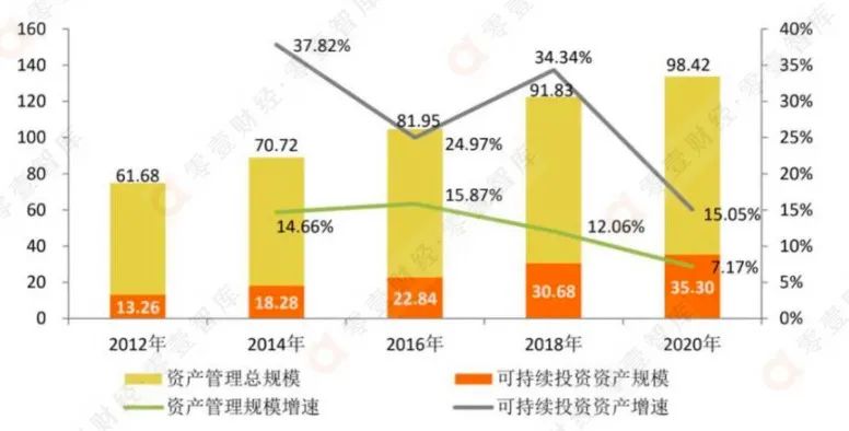 “雙碳”目標下,ESG投資也愈發火熱。根據全球可持續投資聯盟披露的數據,圍繞于全球主要地區(歐洲、美國、加拿大、日本、大洋洲)的ESG投資資產管理規模從2012年初的13.2萬億美元,提升至2020年初的35.3萬億美元,年復合增速為13.02%,遠超過全球資產管理行業6.01%的整體增速。從中國的ESG投資發展來看,截至2020年10月,A股市場ESG基金總規模合計約1287億元。