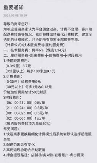 2021年初,為緩解監(jiān)管壓力和商家爭議,美團開始了傭金“透明化改革”,將原先按比例收取的傭金,拆分成技術服務費和履約服務費兩部分,并通過時間分段計費和距離分段計費的方式對履約服務費進行約定。