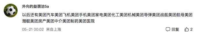 “以后還有美團汽車、美團飛機、美團手機、美團家電、美團化工、美團機械、美團導彈、美團戰(zhàn)艦、美團航母、美團潛艇、美團房產(chǎn)、美團中介、美團制藥和美團醫(yī)院。”