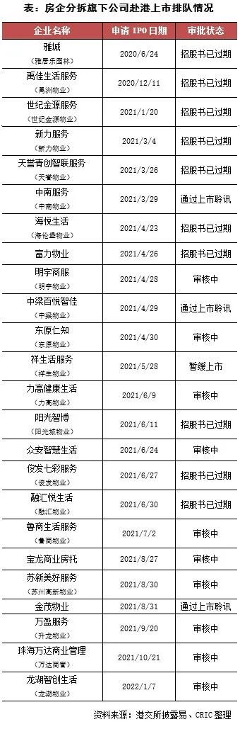 在房企分拆旗下公司上市方面,本月7日龍湖智創生活向港交所首次遞交了招股說明書,此外魯商生活服務和眾安智慧生活也分別在18日和30日更新了招股書。因此截至2022年1月底,在港交所遞交過招股書而仍未上市的房企旗下公司共有24家,其中有多家企業的招股書都已過期,未來是否還會堅持上市有待觀察。除此之外,期后金茂物業在2月6日通過了上市聆訊,有可能很快就會完成IPO。