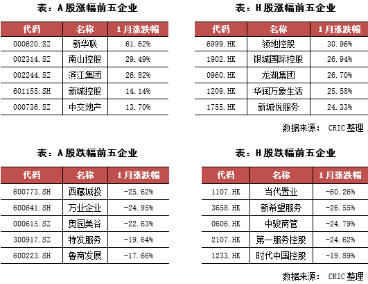 在A股房企方面,本月新華聯的漲幅較大,企業股價在1月有10個漲停板,同時也有5個跌停板,大起大落之下最終整月漲幅達到了61.62%,使其成為A股漲幅最大的房企。