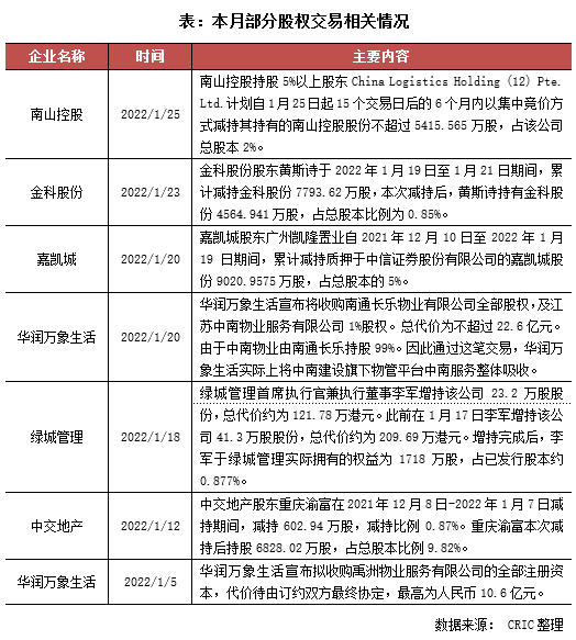 本月沒有房企和房企旗下公司完成上市,在遞表方面,本月7日龍湖智創生活首次向港交所遞交了招股書,同時魯商生活服務和眾安智慧生活都對招股書進行了更新。因此截至2022年1月底,在港交所提交過招股書但仍未上市的房企和房企旗下公司分別有12家和24家。此外值得注意的是本月出現了較多的收并購事件,比如華潤萬象生活就在月內連續并購了兩家大型物管企業,在物管行業和房地產行業收并購機會浮現的背景下,疊加政府對于房企收并購的政策和金融支持,未來可能會浮現一波并購潮。