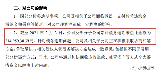 2月4日,藍盾股份(300297.SZ)公告稱,公司及部分子公司累計債務逾期未償還金額約為21.5億元,正在積極采取協商和解方案,爭取盡快與相關債權人就債務解決方案達成一致意見,包括但不限于展期、部分償還等方式。
