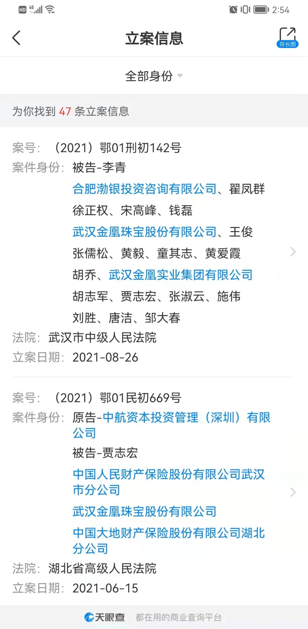 不過對于案件焦點之一的武漢金凰珠寶(下稱“武漢金凰”),日前已經有了新的消息。來自天眼查的數據顯示,8月26日,湖北省武漢市中級人民法院終于刑事立案,案號為(2021)鄂01刑初142號,被告人包括武漢金凰珠寶股份有限公司,賈志宏等一共18人,目前還沒有正式開庭審理。