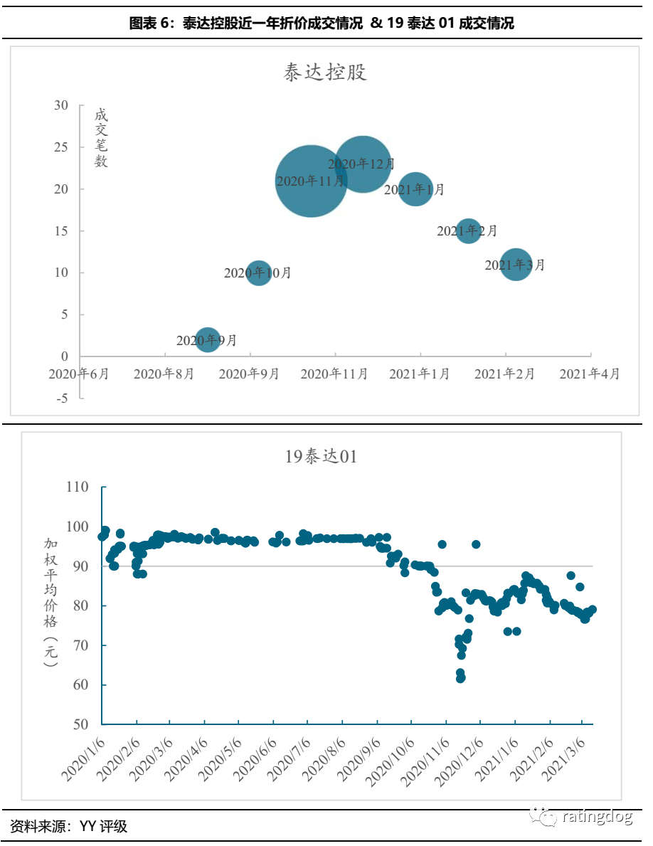 從成交情況來看,津城建折價成交始于20年12月,至21年3月,折價成交開始增多,或受區域負面輿情影響所致。20津投10成交價20年4月以來維持在90以上,20年12月出現零星折價成交,21年2月底價格走低重現折價成交。