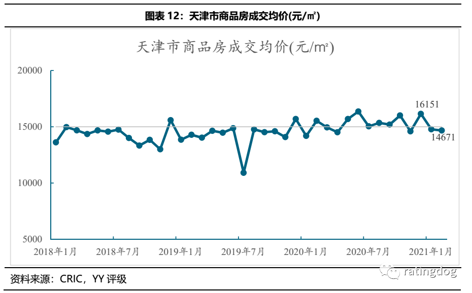 根據CRIC的統計數據,天津市商品房成交均價整體較為平穩,20年以來突破15,000元/m2,小幅震蕩波動,21年2月房價14,671元/ m2。