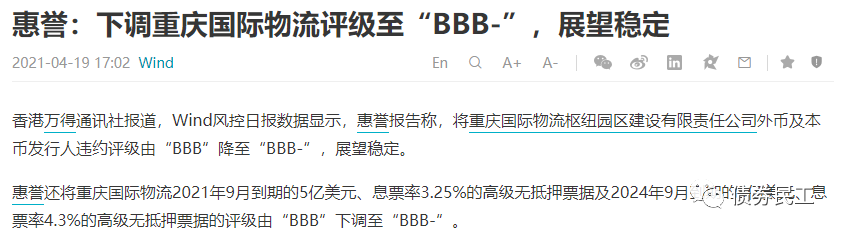 2021年4月29日,境外評級機構惠譽同時下調了重慶國際物流樞紐園區建設有限責任公司和重慶市南岸區城市建設發展(集團)有限公司的評級級別,由BBB下調至BBB-。