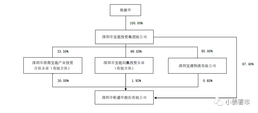 從股權結構看,鉅盛華的控股股東為寶能集團,持股比例為67.4%,公司實際控制人為姚振華。