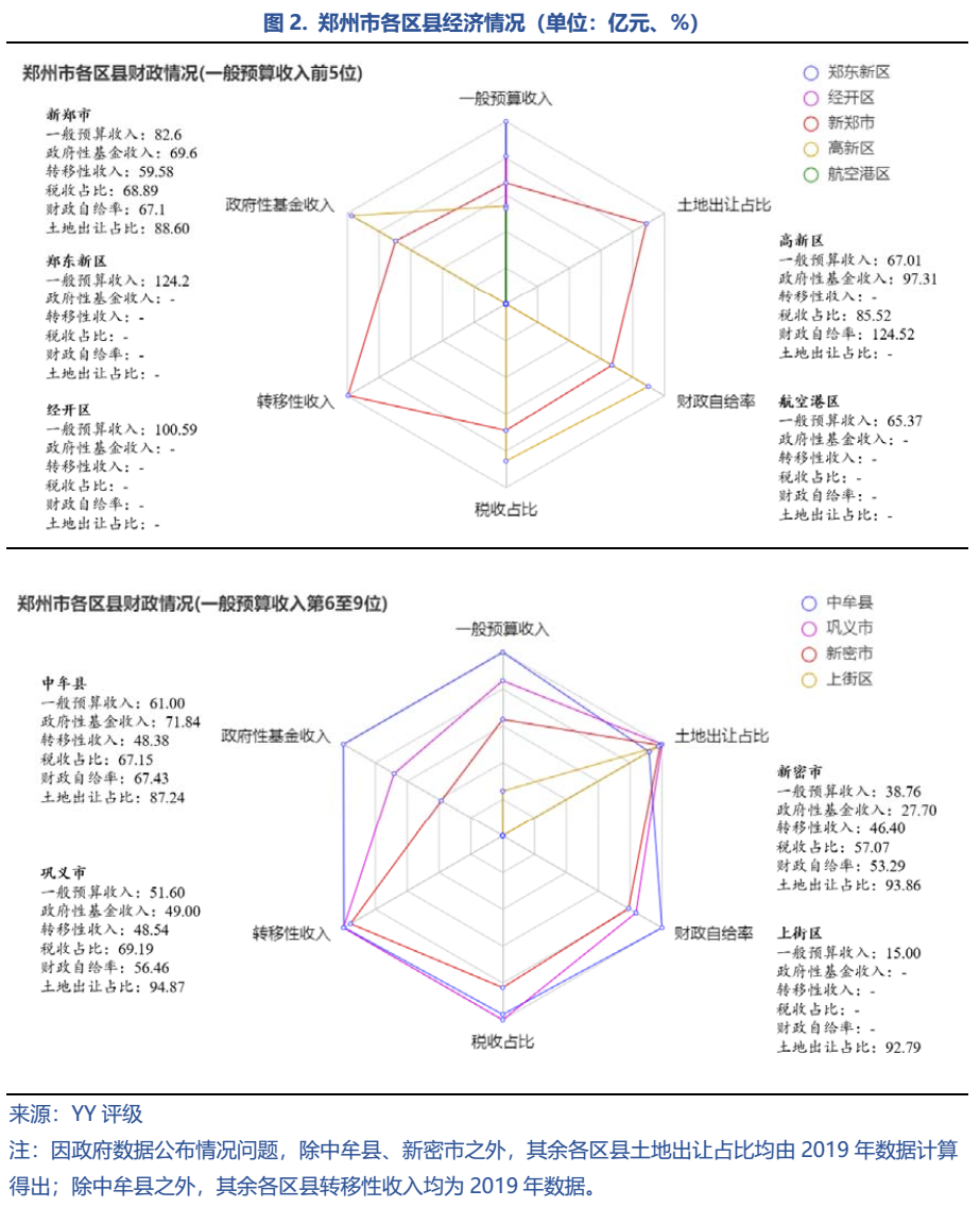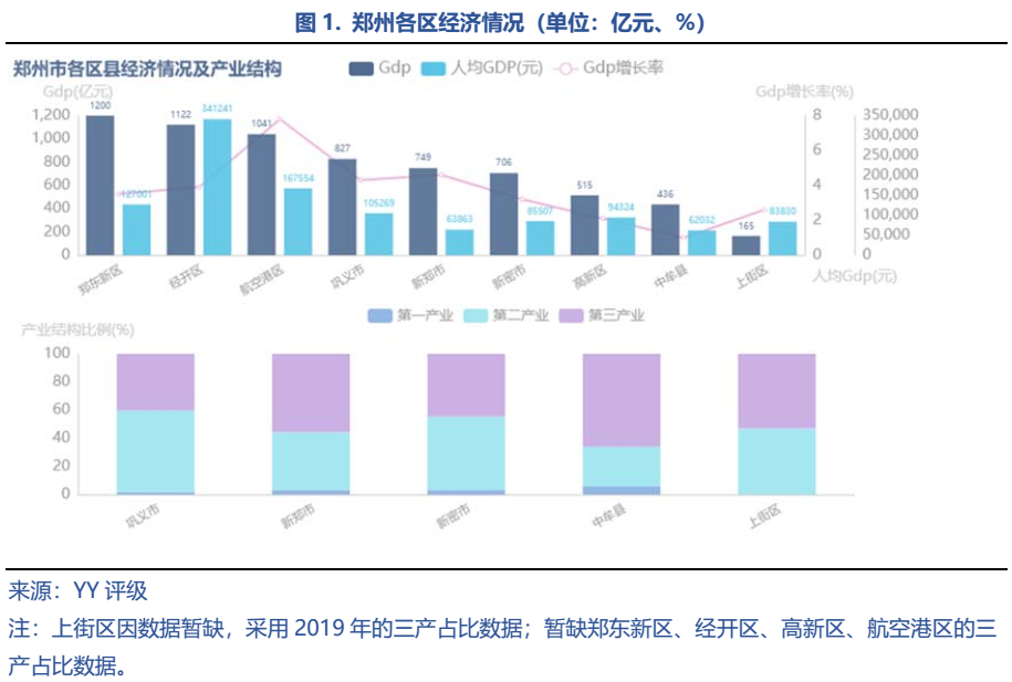 鄭州市現轄6區5市1縣及鄭州航空港經濟綜合實驗區、鄭東新區、 鄭州經濟技術開發區、鄭州高新技術產業開發區,四大園區定位各不相同:航空港區是我國第一個以航空經濟為引領的國家級新區;鄭東新區則是中原經濟區金融集聚核心功能區、全省推進城鎮化建設的先行區和國家大數據綜合試驗區核心區;經開區側重發展了汽車及零部件、裝備制造、現代物流三大千億級主導產業;高新區則定位于“發展高科技、實現產業化”,擁有完善的創新孵化培育體系。鄭州共有9個發債區縣,在發債各區中,鄭東新區GDP總量領跑,人均GDP位居前三,經濟實力較強。以汽車和裝備制造等為主導產業的鄭州經開區人均GDP一馬當先,高達34.1萬元居全市首位,GDP總量在2019年首破千億大關的基礎上也再創新高。此外,航空港區GDP也過千億大關,上街區、中牟縣和高新區則以較低的GDP總量居末尾。