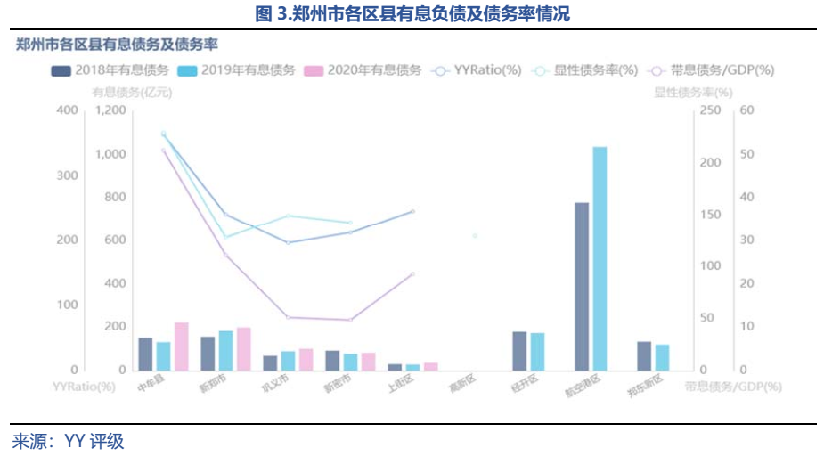 鄭州市總體債務率不高,分區域看,因發展需要,航空港區2018、2019年有息債務“一騎絕塵”,但2020年數據尚未披露完整。從目前可得的2020年的債務數據來看,中牟縣的帶息債務絕對值和債務率均最高,截至2020年末,中牟縣有息債務余額為222.32億元,YY-Ratio為364.46%,債務風險并不高;新鄭市的有息債務余額和債務率次之;值得注意的是,上街區的有息債務余額雖然不高,但因財政實力較弱,YY-Ratio較高。