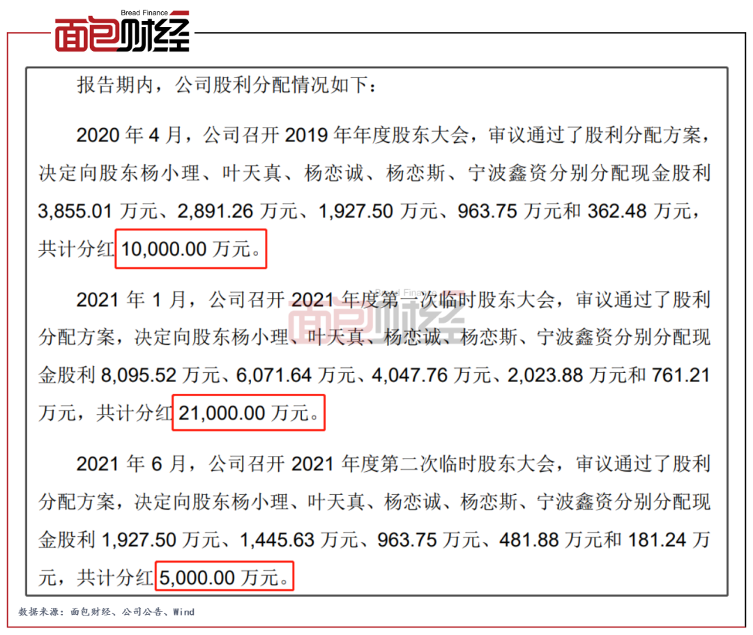 2020年4月,公司召開2019年年度股東大會,決定分配現(xiàn)金股利共計1億元,分紅金額超出2019年度公司歸母凈利潤近87萬元;2021年1月和6月,公司召開兩次臨時股東大會,共分配現(xiàn)金股利2.6億元,分紅金額超出公司2021年上半年歸母凈利潤近1.2億元。按照楊小理、葉天真夫婦及其子女所持股份比例計算,四人通過三次分紅獲得近3.55億元。