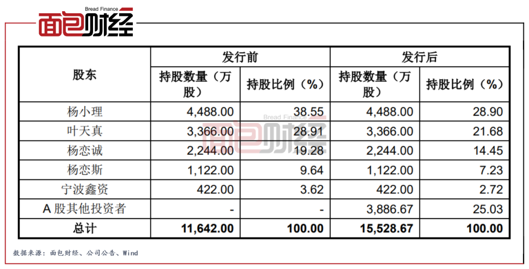 此外,截至公司招股說明書申報稿簽署日,公司的控股股東、實際控制人為楊小理、葉天真、楊戀誠及楊戀斯。楊小理與葉天真為夫妻關(guān)系,楊戀斯、楊戀誠為上述二人的子女,四人共直接持有公司96.38%的股份,其中葉天真又通過員工持股平臺寧波鑫資間接持有公司2.37%股份。其四人通過直接和間接持有公司股份比例達98.77%,股權(quán)高度集中。