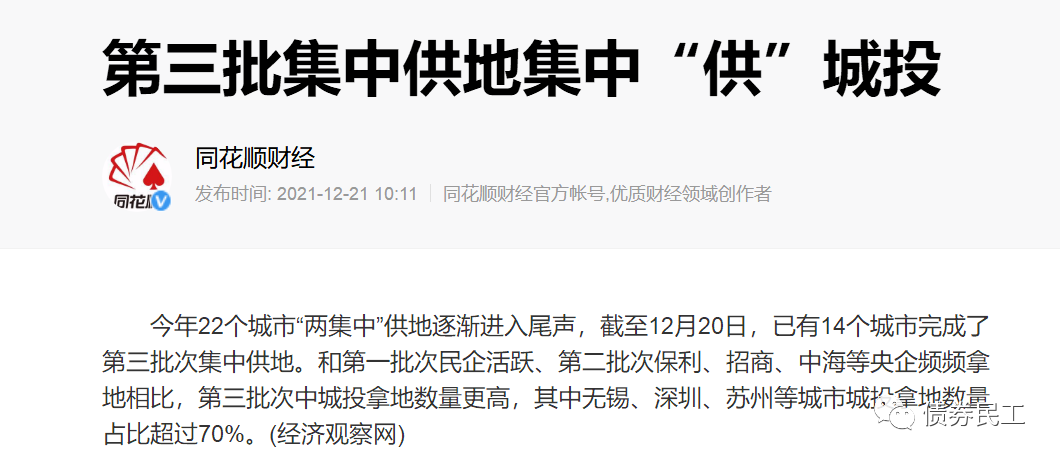 2021年對于房地產(chǎn)公司來說,是一個(gè)轉(zhuǎn)折之年,面臨的挑戰(zhàn)非常之大,部分房地產(chǎn)公司甚至已經(jīng)發(fā)生了違約。但是城投公司開始布局優(yōu)質(zhì)房地產(chǎn)業(yè)務(wù)了(詳見部分城投公司已經(jīng)開始布局優(yōu)質(zhì)房地產(chǎn)業(yè)務(wù)!)。從近期的公開數(shù)據(jù)來看,城投公司布局優(yōu)質(zhì)房地產(chǎn)業(yè)務(wù)的速度在加快,在第三批集中供地中,部分城市的城投公司拿地?cái)?shù)量占比超過了70%。