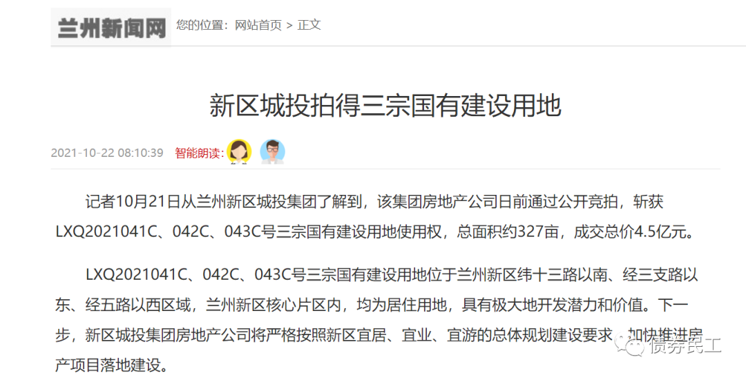 2021年10月22日,蘭州新區(qū)城市發(fā)展投資集團(tuán)有限公司的下屬子公司蘭州新區(qū)房地產(chǎn)開發(fā)有限公司以4.5億元的價(jià)格摘得蘭州新區(qū)總出讓面積為327畝的土地,土地性質(zhì)為住宅用地。