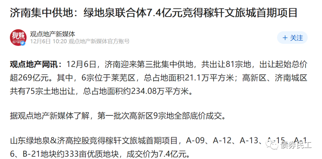 2021年12月6日,濟(jì)南市投資控股集團(tuán)有限公司聯(lián)合山東綠地泉以7.4億元的價(jià)格摘得稼軒文旅城首期項(xiàng)目總出讓面積為333畝的土地。