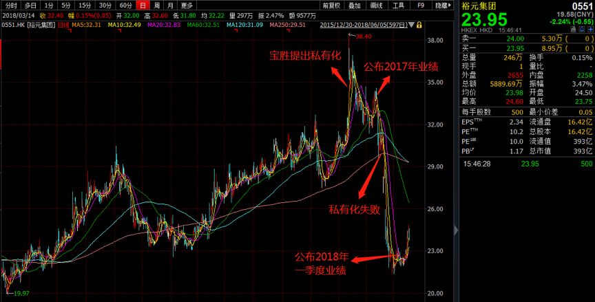 裕元集團(tuán)在寶勝提出私有化要約第二日股價(jià)創(chuàng)下歷史高點(diǎn)38.4港元,但是隨著2017年利潤(rùn)下滑公告披露和寶勝私有化宣告失敗,裕元集團(tuán)的股價(jià)不斷下跌,目前股價(jià)約為24港元,較最高點(diǎn)下跌了37.63%,一舉回到一年前的股價(jià)水平。