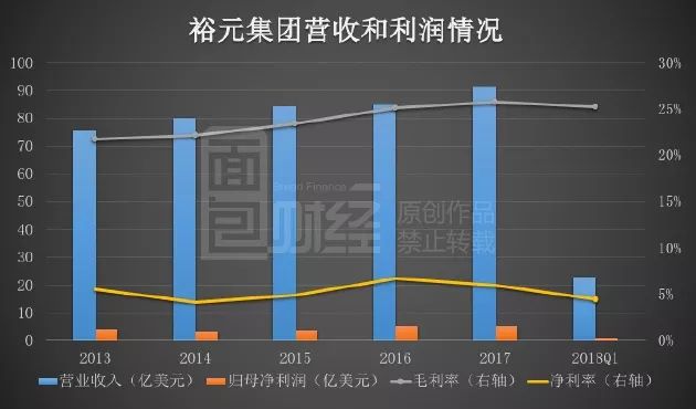 2017年裕元集團(tuán)營(yíng)收為91.21億美元,同比增長(zhǎng)7.6%,歸母凈利潤(rùn)為5.19億美元,同比下降2.87%。