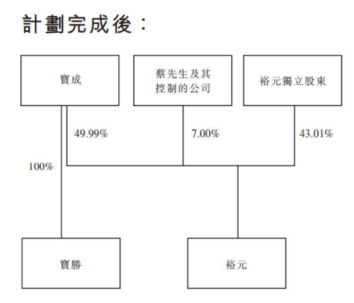 2008年,裕元集團(tuán)將寶勝國(guó)際在港股分拆上市。十年后的2018年1月21日,寶勝國(guó)際公告稱,寶成工業(yè)提出每股2.03港元私有化上市公司,即將大股東裕元集團(tuán)和其余股東手中全部股份收購(gòu)注銷,將耗資109億港元。前一交易日收盤價(jià)為1.54港元,溢價(jià)31.82%。下圖為假設(shè)私有化完成后的持股情況: