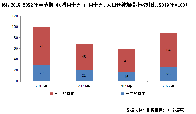 ①注:考慮到春節假期是按照傳統農歷來定的,我們測算人口遷徙總量是根據春節前后一個月的時間周期來測算(臘月十五-正月十五),2019年=100。