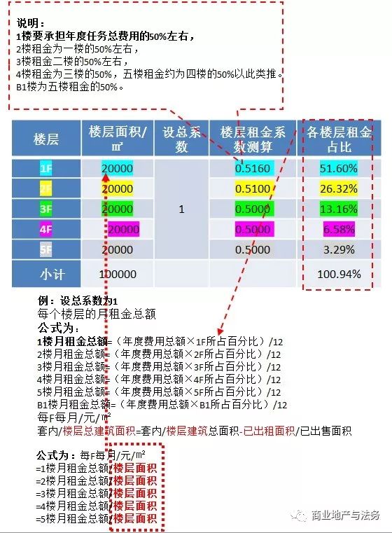 然后設定樓層租金系數,測算樓層租金占百分比: