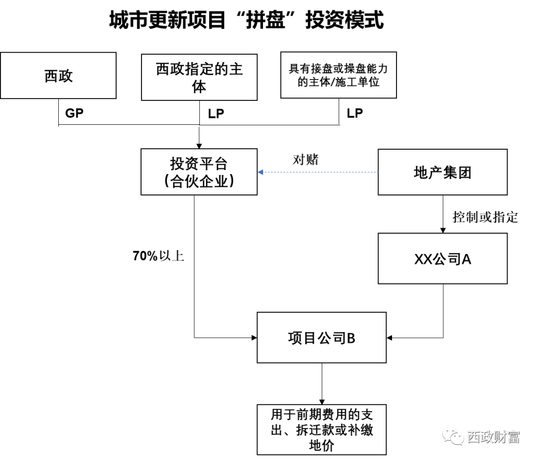 1.西政作為GP與西政指定的主體(國企金控平臺、外資機構、資產管理公司等)以及具備接盤或操盤能力的主體/施工單位共同成立投資平臺(備注:若與國央企類融資主體合作,則該國央企需為該城市更新項目未來的操盤主體,并約定對賭退出條件;若與民企類融資主體合作,該民企則需提供相應的集團擔保,并約定對賭退出條件)。
