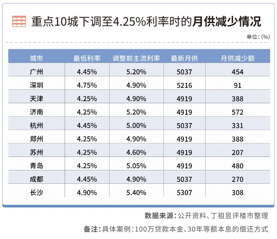 不少城市下調(diào)房貸利率至4.25%以后,我們按照“100萬貸款本金、30年等額本息方式”的貸款方式進(jìn)行測(cè)算,以重點(diǎn)10個(gè)城市為例,月供平均減少約350元,其中廣州、天津、濟(jì)南、青島月供減少均在平均值以上。