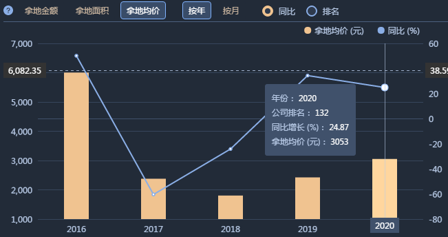 今年以來,綠地的拿地均價為3053元,較去年同期上漲24.87%。從項目分布來看,新增土儲集中在二線城市(二線城市新增拿地金額為719.11億元),新增土儲排名前三的城市分別為武漢市(206.78億元)、蘇州市(112.88億元)、西安市(87.44億元)。