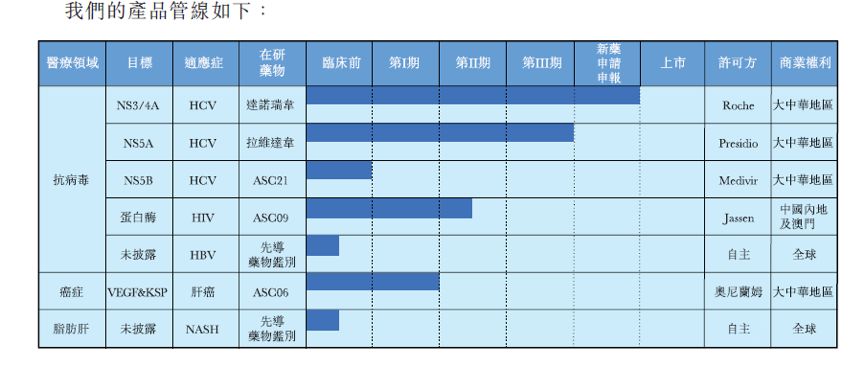 公司的核心產品包括戈諾衛(wèi)(達諾瑞韋)、拉維達韋、ASC09以及ASC06。目前中國食品藥品監(jiān)管總局于2018年6月8日授出有關戈諾衛(wèi)的新藥申請批準,并在國內開始將戈諾衛(wèi)進行商業(yè)化。以下是公司7個在研藥品的研發(fā)進度。