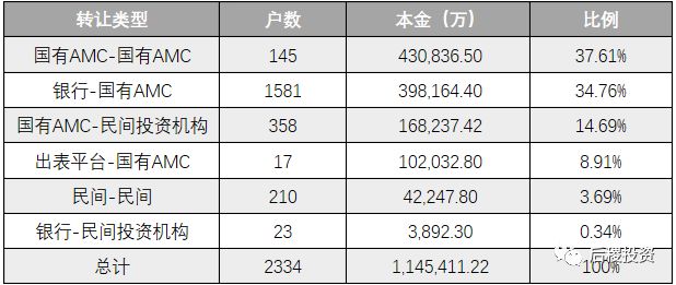 從統(tǒng)計(jì)數(shù)據(jù)中來看,全年成交114億,其中國有AMC-國有AMC、銀行-國有AMC成交占比70%以上,民營機(jī)構(gòu)收購轉(zhuǎn)讓占比不到20%,整體來看民營投資不良資產(chǎn)參與度不高。