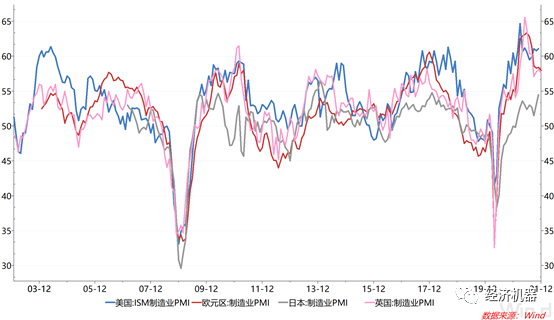 海外需求整體繼續向好。盡管奧密克戎病毒在海外肆虐,但海外經濟依然景氣。12月歐洲元區和英國的制造業PMI較上月有所回落,仍維持在58%左右的高位。11月美國PMI61.1%較10月回升,也表現出了較高的景氣度(圖6)。