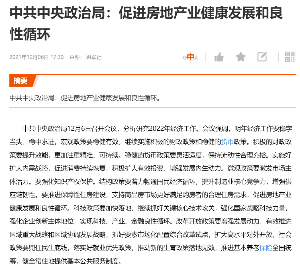 12月6日政治局會議召開。個人認為,此次政治局會議關于地產的表態是超預期的。