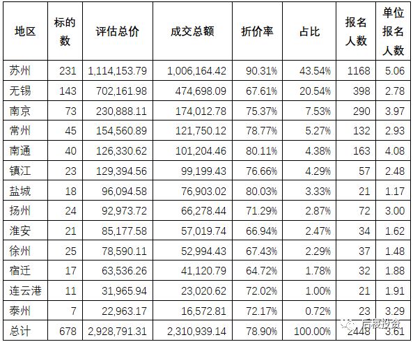 投資策略方面,穩健型投資人,可以重點參與蘇州地區的投資,該地區資產流動性佳,體量也夠大,具有較高的安全邊際,比較適合資金成本低,期望回報率不高投資人,此外,單個拍品報名人數達5個,處置回收方面可能會有意外收獲。