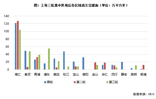 對比上海三輪集中供地的成交情況來看,成交體量呈現先跌后漲的“凹”字型走勢:首輪含宅地塊的成交量最高,建面達到394萬平方米,第二輪降至241萬平方米,第三輪又回升至313萬平方米。