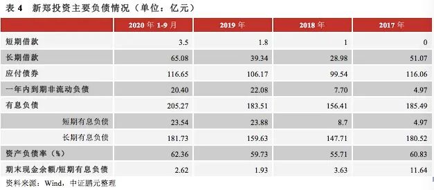 新鄭投資的外部融資,以債券為主,銀行借款為輔。第一,2017年來債券融資在有息負(fù)債中的占比超過50%,2017年為63%,2020年三季度末為57%。截至2021年3月末,公司債券的發(fā)行方式均為私募。第二,有息負(fù)債中,以長期債務(wù)為主,占比在80%以上,2019年來隨著債務(wù)到期,短期有息占比從2017年的3%上升至2020年三季度末的11%。第三,公司資產(chǎn)負(fù)債率2018年維持上升趨勢,期末現(xiàn)金對短期有息負(fù)債的覆蓋倍數(shù)近年有所下滑,但仍位于較高水平。