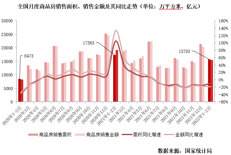 據(jù)國家統(tǒng)計局?jǐn)?shù)據(jù):1—2月,商品房銷售面積15703萬平方米,同比下降9.6%;商品房銷售額15459億元,下降19.3%。