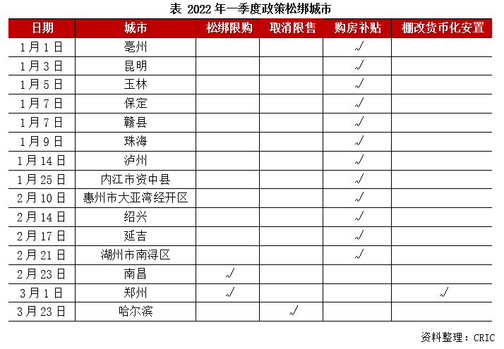 2022年一季度,中央多部委密集表態(tài)穩(wěn)地產(chǎn),財政部明確今年內(nèi)不具備擴大房地產(chǎn)稅改革試點城市的條件,兩會定調(diào)探索行業(yè)新發(fā)展模式,支持新市民等三類購房需求。房企融資、預(yù)售資金監(jiān)管適度松綁,并購貸不計入“三道紅線”、保障性租賃住房貸款不計入“兩道紅線”、全國性商品房預(yù)售資金監(jiān)督管理辦法出臺。居民按揭貸款政策邊際改善,各地放寬公積金貸款、下調(diào)首付比例、局部放松限貸、下調(diào)房貸利率。15城出臺新政刺激購房需求,重點涉及松綁限購、取消限售、發(fā)布購房補貼、棚改貨幣化安置等。