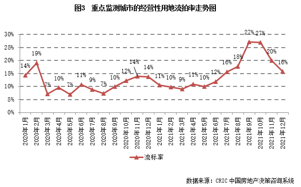 2021年12月,在17城三輪集中土拍收官及三四線城市土地成交放量的拉動(dòng)下,年末土地成交翹尾現(xiàn)象如期而至,當(dāng)月成交規(guī)模突破4億平方米,同比也僅下降了3%。與此同時(shí),信貸環(huán)境邊際改善下,土地流拍現(xiàn)象也有所好轉(zhuǎn),集中土拍的重點(diǎn)城市中僅個(gè)別城市流拍率較上一輪大增。
