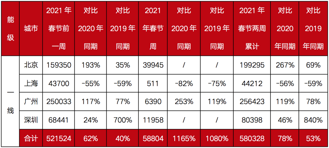 一線城市在春節期間表現可圈可點,2021年春節兩周成交量增幅較2020年和2019年同期均大幅上漲50%以上。