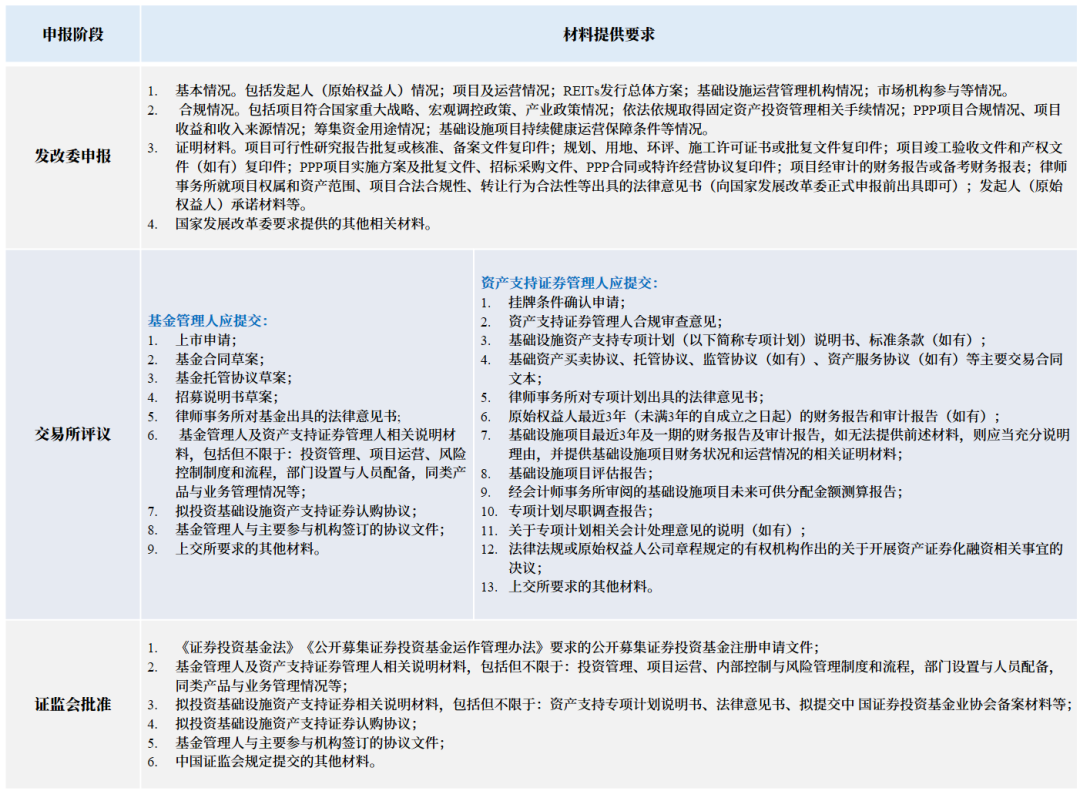 其二, 對市場機構關注的公募REITs申請材料(見下方表格梳理)、無異議函等問題進行了明確。公募REITs申請上市需提交的材料多于普通基金產品, 信息披露要求更高; 對于通過審核的公募REITs產品, 交易所將對資產支持證券及公募基金合并出具無異議函; 此外, 明確了公募REITs新購入基礎設施項目的, 則需向交易所提交變更申請并重新取得無異議函。