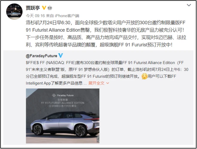 7月28日,賈躍亭在微博中表示,“洛杉磯7月24日早6:30,面向全球極少數(shù)塔尖用戶開放的300臺邀約制限量版FF 91 Futurist Alliance Edition售罄”。