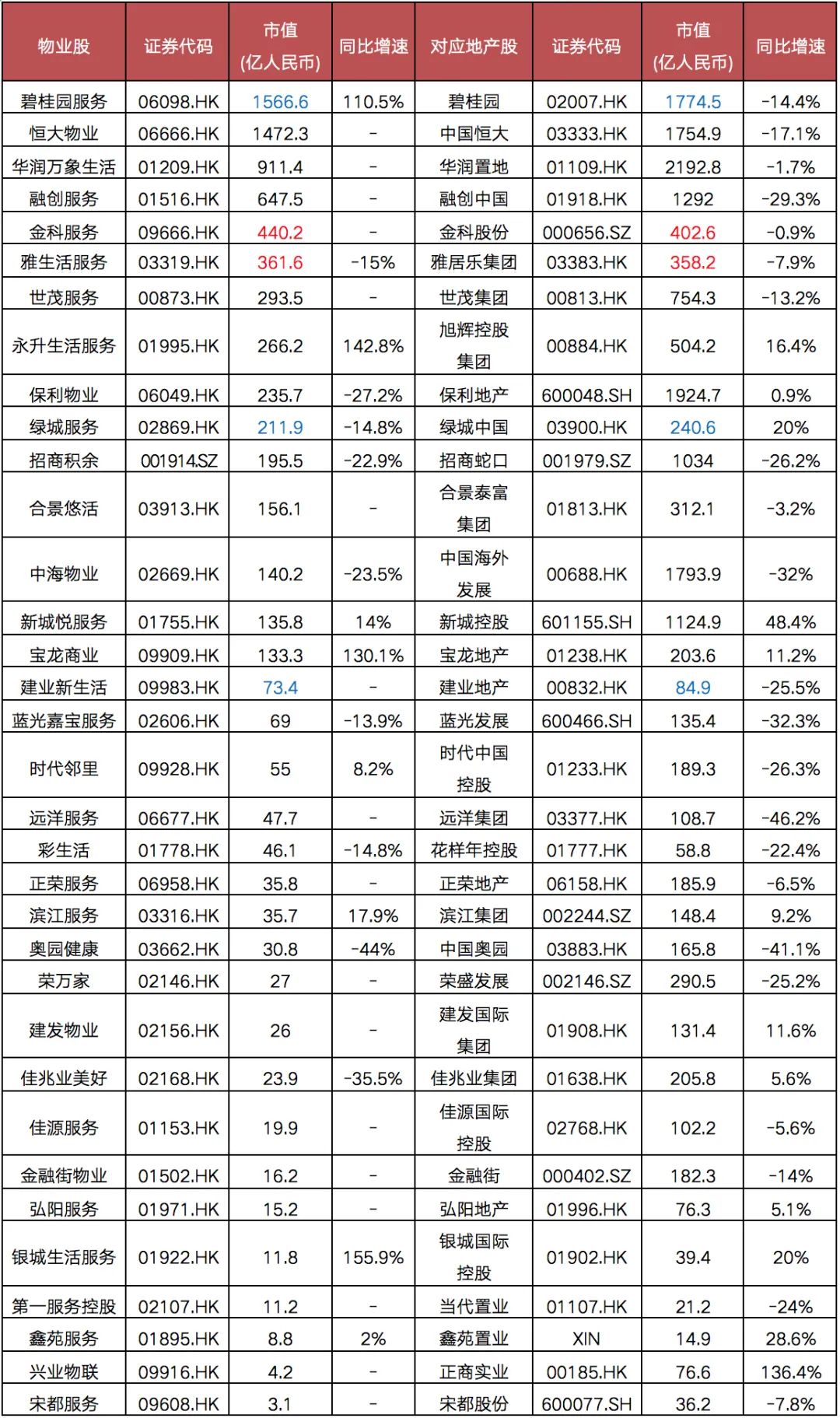 表:地產(chǎn)股和物業(yè)股的目前總體市值情況對比